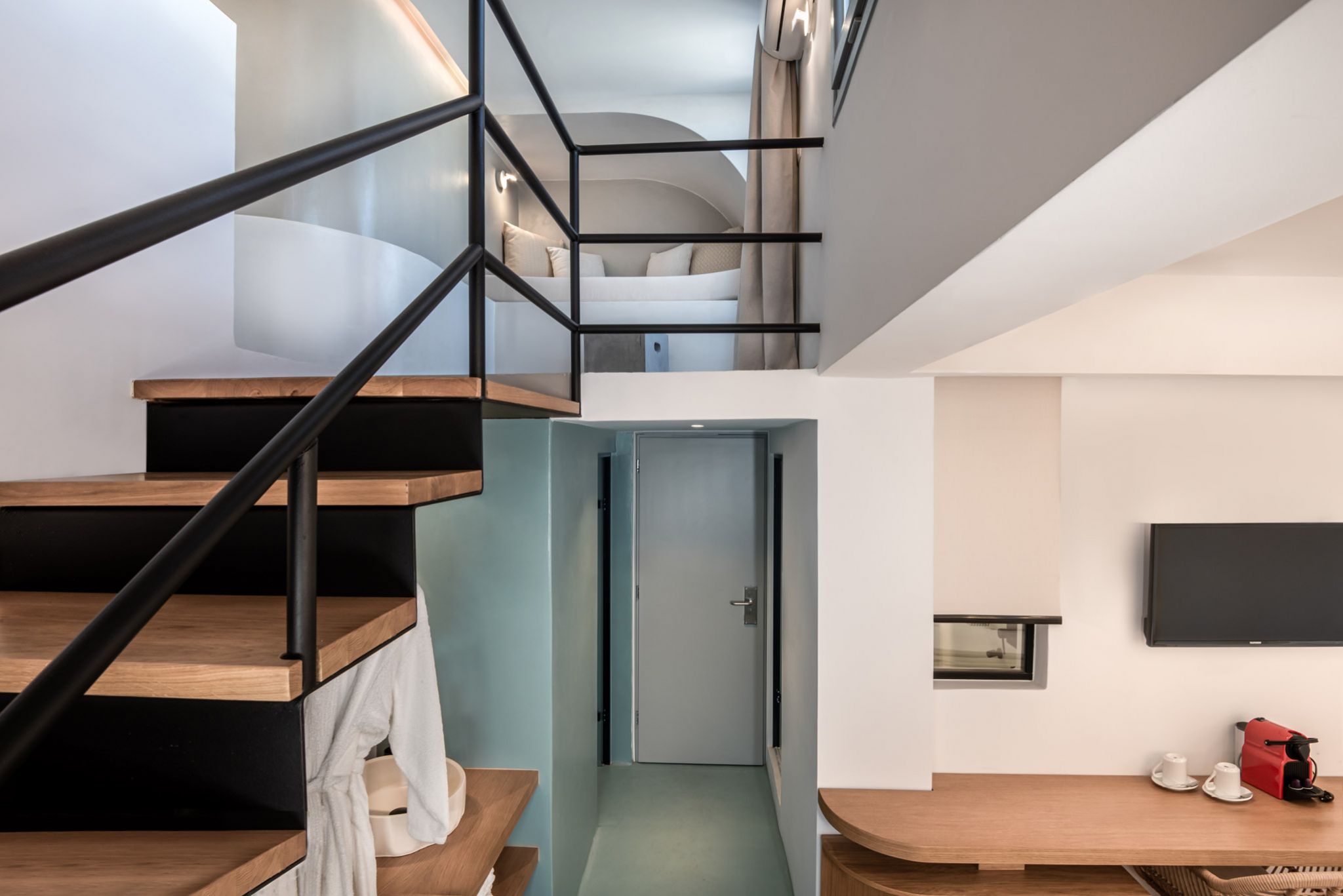 There is an upper sitting area with a built sofa where you can lie back and relax. The bathroom is equipped with a hydromassage shower jet that will surely have a de-stressing effect on you.